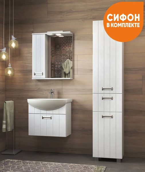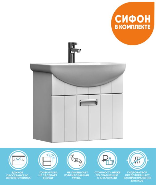 Тумба подвесная, 1 вестительный выдвижной ящик; ручка врезная металлическая хромированная.Специальный сифон Vigo в комплекте.Материал корпуса: влагостойкая ЛДСПМатериал фасадов: ЛМДФПокрытие: пленка ПВХЯщики: направляющие полного выдвижения.