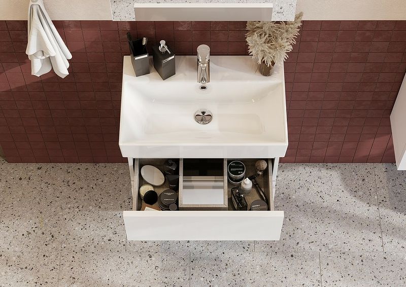 Тумба под раковину позволяет использовать мебель Oleta даже в небольших ванных комнатах. Несмотря на компактную глубину, тумба комплектуется раковиной Oleta с достаточно вместительной чашей. Лаконичный и современный дизайн раковины притягивает к себе взгляд. 2 выдвижных ящика тумбы установлены на направляющие HETTICH, которые гарантируют продолжительную безупречную функциональность и максимальный комфорт эксплуатации. Скрытый монтаж не портит элегантный дизайн мебели, а возможность полного выдвижения обеспечит быстрый доступ к необходимым предметам. Внутренняя отделка ящиков выполнена в цвете бежевый текстиль, приятна на ощупь и предотвращает скольжение предметов. Профильная ручка во всю ширину фасада удобна в использовании и позволяет сочетать мебель Oleta c различными цветами смесителей и аксессуаров для ванной комнаты. Ручка выполнена в виде J-профиля.