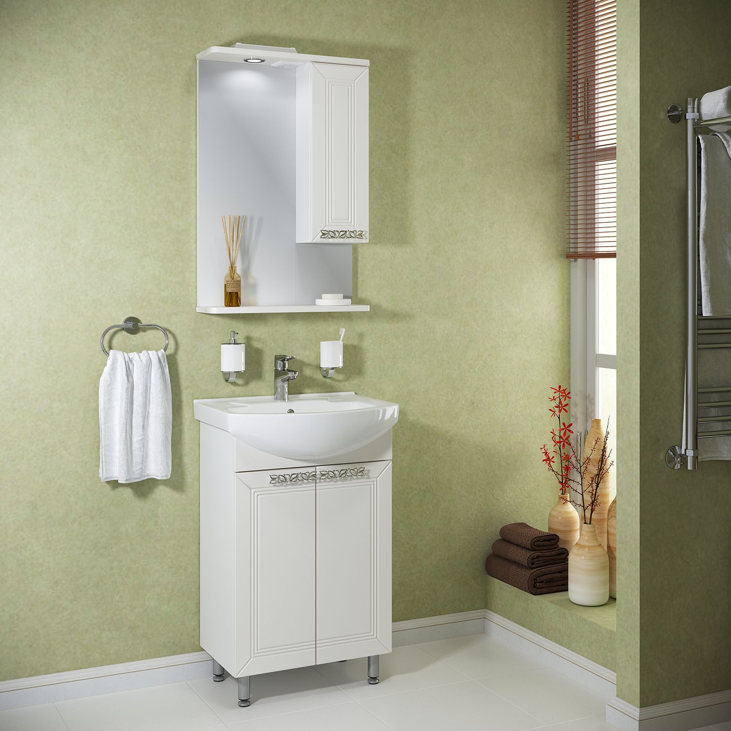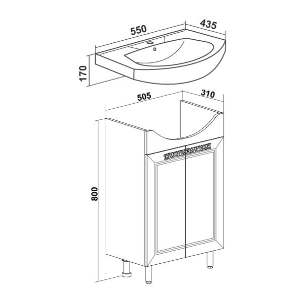 Тумба под умывальник напольная с двумя распашными дверками и одной внутренней полкой. Петли со встроенным доводчиком, ручки - 2шт, ножки хром - 2шт, ножки пластик -2шт.