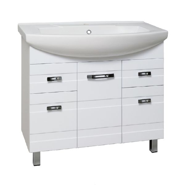 Тумба под умывальник на ножках с тремя распашными фасадами и двумя боковыми выдвижными ящиками. За центральным фасадом -одна внутренняя полка. Петли со встроенным доводчиком, ящики на шариковых направляющих полного выдвижения, ручки - 5шт, ножки хром - 2шт, ножки пластик -2шт.