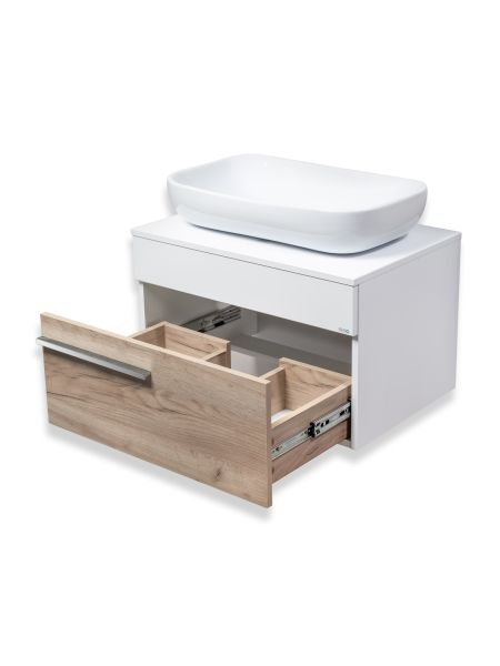 Тумба под раковину в ванную RUNO ВУДЛАЙН (подвесная) - выполнена в ультрасовременном дизайне в цвете крафтовый дуб. Тумба в ванную оснащена выдвижным ящиком на шариковых направляющих. Тумба под раковину ВУДЛАЙН гармонично впишется в любой интерьер ванной комнаты. В комплект входят: 1 ручка, навесы для крепления к стене. К тумбе для ванной комнаты подходят накладные керамические раковины: Infinity 60 с чашей прямоугольной формы (600х370 мм), глубиной 12 см; Moduo 50 SQUARE с чашей прямоугольной формы (500х360 мм), глубиной 15 см; Moduo 55 LEAF - асимметричная раковина, которую можно установить любой стороной, дизайнерское решение для нестандартных интерьеров (565х365 мм), глубиной 15 см; Гамма 56 - c глубокой чашей и высокими бортиками, которые отражают современные тренды в дизайне. (560х370 мм), глубиной 18 см. Мебель для ванной RUNO - красота и практичность в мелочах!