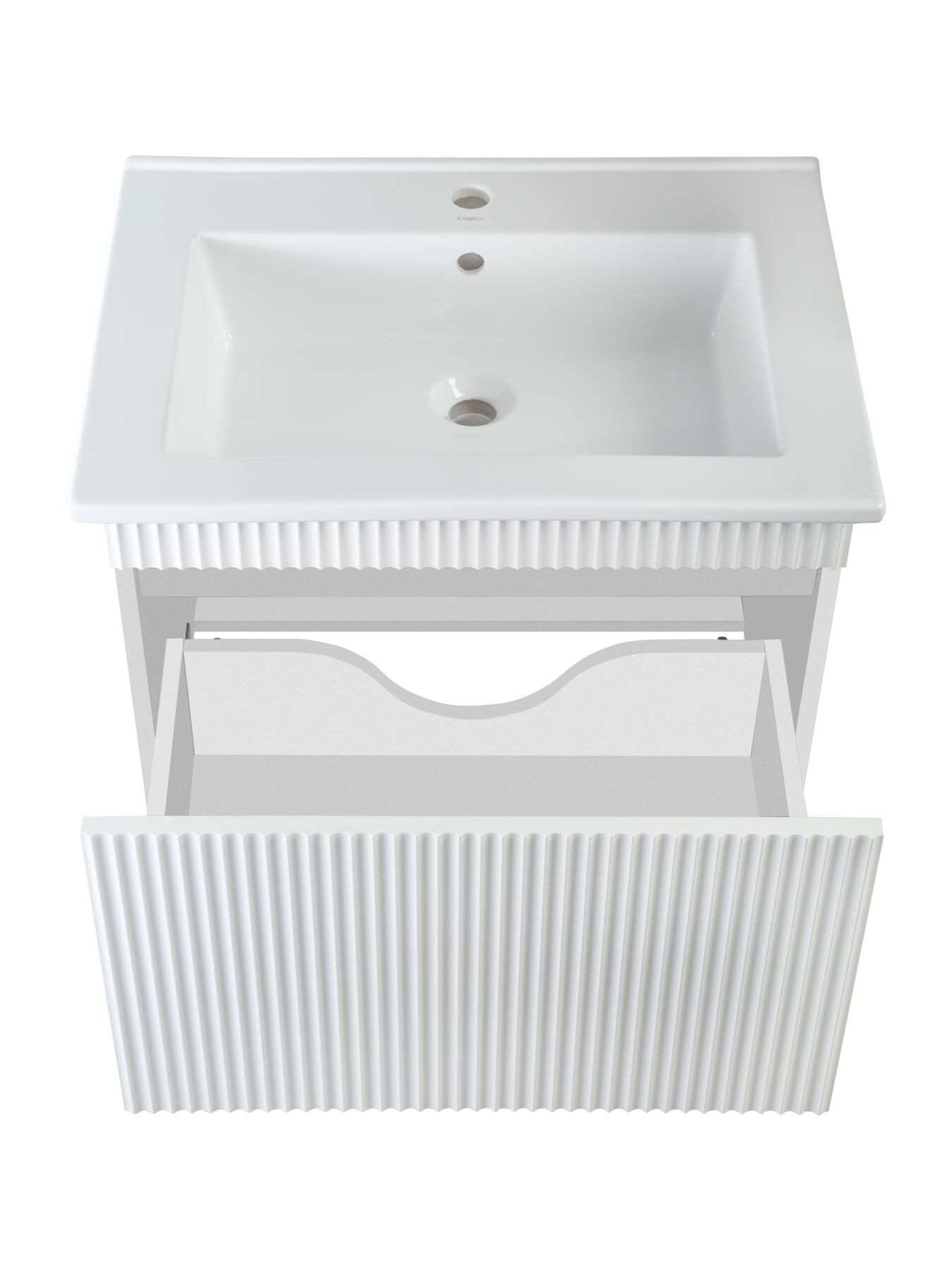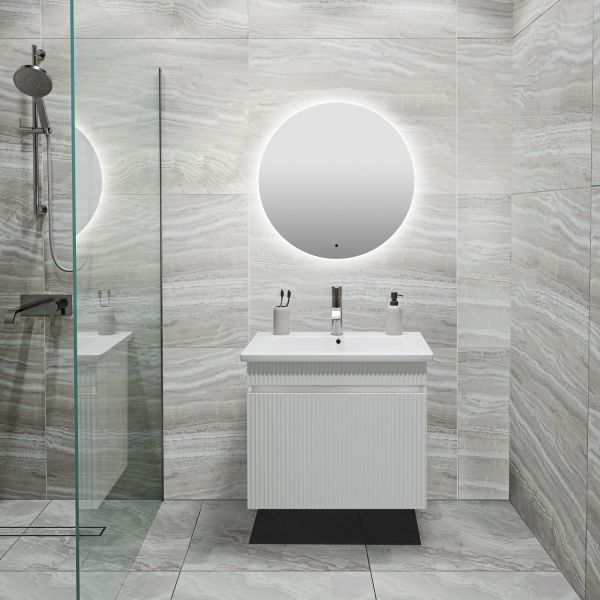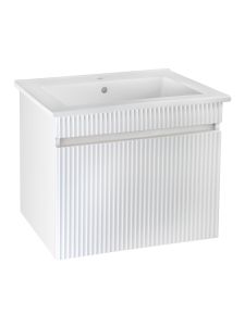 Тумба под раковину МОДЕНА (подвесная) – это изысканность и утончённая роскошь в интерьере. Волнистые рифленые фасады визуально «оживляют» и «приводят в движение» всю обстановку комнаты, сохраняя при этом умиротворение и покой, превосходно сочетаются с классическим белым цветом корпуса. Цвет фасада также классический – белый глянец, идеально впишется в любой интерьер ванной комнаты. Тумба для ванной оснащена выдвижным ящиком на шариковых направляющих, к тумбе для ванной подходит накладная керамическая раковина «Оскар» (660х470 мм). Раковина глубиной 19 см. Мебель для ванной RUNO - красота и практичность в мелочах, тумба под раковину для ванной комнаты Модена – лучший выбор для Вашей ванной комнаты!