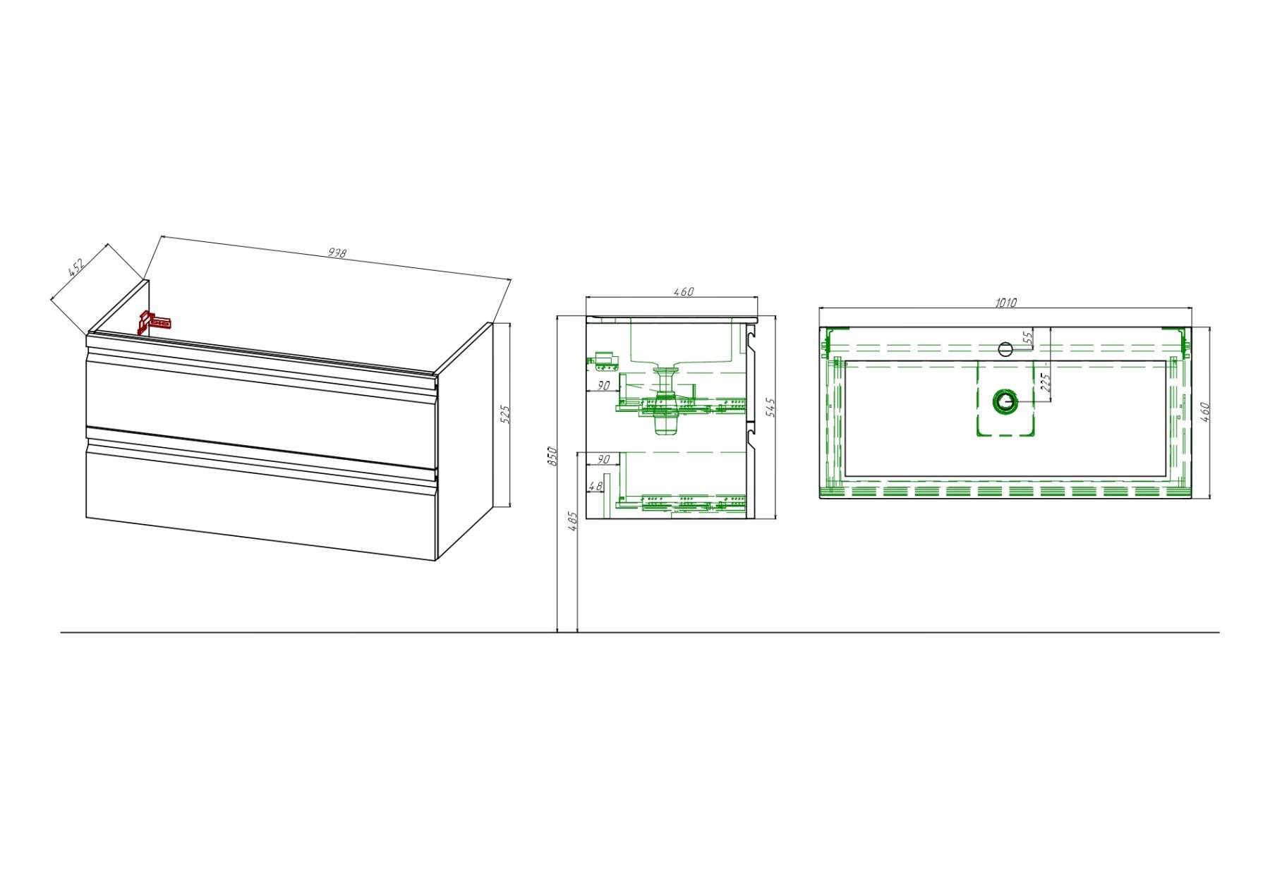 Габариты (Д В Ш), мм: 1010*545*46Материал корпуса тумбы: ЛДСП 16мм Эггер с последующей покраской в 5 слоевМатериал фасада тумбы: ЛМДФ 22мм Эггер с последующей покраской в 5 слоевМонтаж: подвеснойМатериал раковины: 100% санфарфорДва выдвижных ящикаНаправляющие с доводчиком GTV, плавное скольжение и мягкое закрываниеНавесы усиленные (100кг/пара)Мебель поставляется в собранном видеДля сифона диаметром 1 1/4 x 32 ммГарантия: на мебель 2 года, на раковину 10 лет