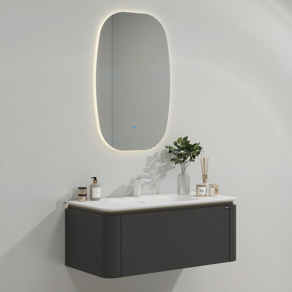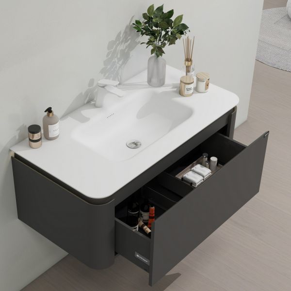 Тумба с раковиной для ванной комнаты датского производителя Black&White в габаритных размерах 120x52x40 см.Данная версия является продолжением линейки U 925 в сером цвете. Раковина — столешница изготовлена из не пористого искусственного камня Corian, который тактильно ощущается как soft touch материал, он легок и прост в уборке,а слив оборудован донным клапаном хромированного цвета. База производится из влагостойкой девятислойной фанеры и покрыта эмалью для долгосрочного сохранения материала.Важной особенностью является контурная диодная подсветка, которая расположена по периметру столешницы.На тумбе предусмотрен один выдвижной ящик, оборудованный фурнитурой UniHopper с доводчиками.Коллекция U 935– эргономичный и продуманный продукт,который наполнит Вашу ванную комнату уютом, а плавные и утонченные формы впишутся в любые современные интерьеры.