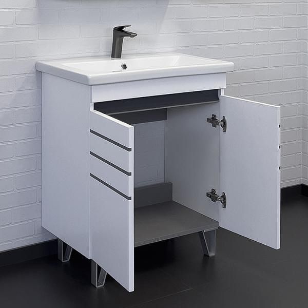 Тумба с раковиной Comforty Нарва 00-00015236 70 см белыйНапольная тумба-умывальник с двумя распашными створками. Створки тумбы декорированы вставками из керамогранита цвета графит. Петли створок оснащены механизмами плавного закрывания. Тумба подготовлена для подключения водоснабжения снизу.Характеристики:Тумба:Цвет: белый матовый.