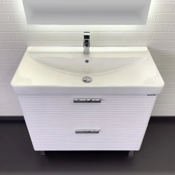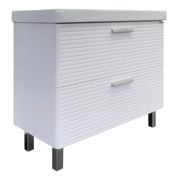 Тумба с раковиной Comforty Танжер 00-00019535 90 см белыйНапольная тумба с двумя выдвижными ящиками оснащенными направляющими с системой плавного закрывания. Оригинальные эргономичные ручки цвета хром. Фасады тумбы изготовлены из МДФ, фрезерованы горизонтальным узором и облицованы белой матовой пленкой. Тумба подготовлена для подключения водоснабжения снизу и сзади. В комплекте: керамическая раковина Comforty 4490