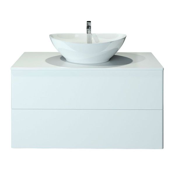 Подвесная тумба с раковиной-чашей и столешницей МДФ, с двумя выдвижными ящиками. Предназначена для использования в ванных комнатах с повышенной влажностью. Система Push to Open: ящики открываются нажатием на них. Высокое качество сборки, материалов и фурнитуры. Столешница, корпус и фасад: МДФ, плёнка ПВХ белая глянцевая. Раковина накладная (глубина 10 см) - фаянс.