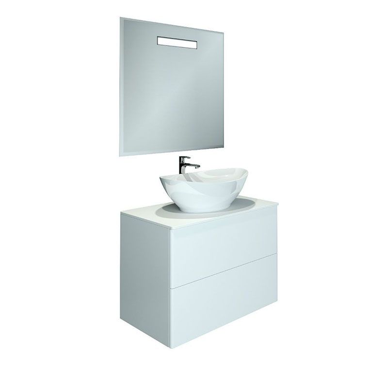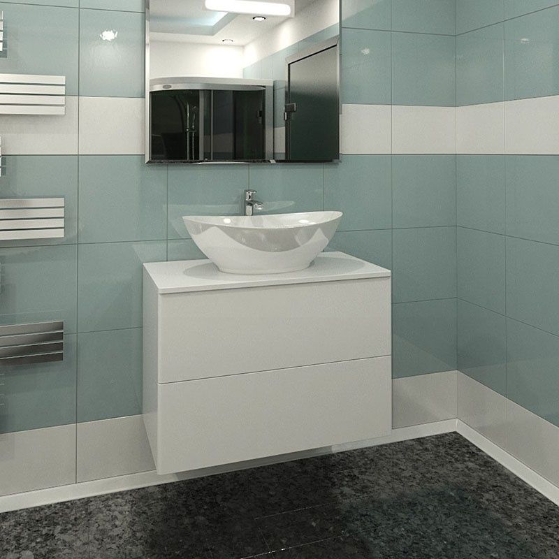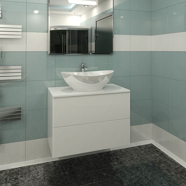 Подвесная тумба с раковиной-чашей и стеклянной столешницей, с двумя выдвижными ящиками. Предназначена для использования в ванных комнатах с повышенной влажностью. Система Push to Open: ящики открываются нажатием на них. Высокое качество сборки, материалов и фурнитуры. Корпус и фасад: МДФ, плёнка ПВХ белая глянцевая. Раковина накладная (глубина 10 см) - фаянс. Столешница: стекло окрашенное.