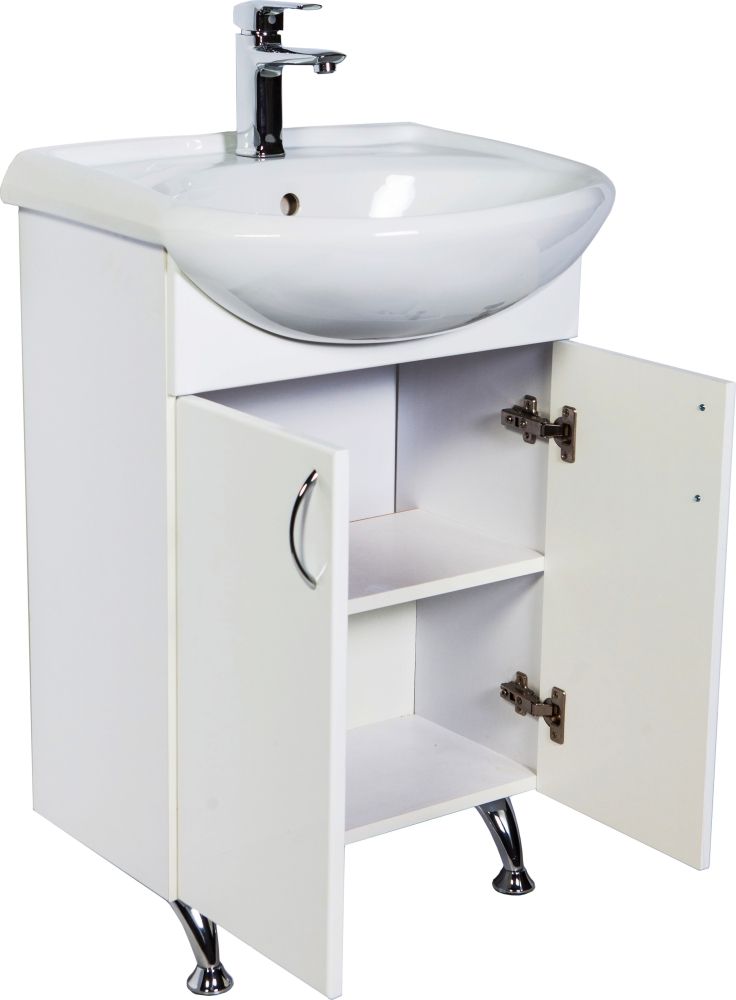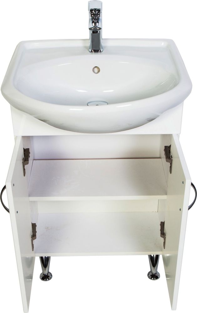 Напольная тумба с раковиной. Дверки c механизмом доводчика, обеспечивающим плавное закрывание. Фасад МДФ в пленке, цвет белый глянец. Корпус ЛДСП - белый глянец. Раковина - фарфор. Фурнитура в цвете хром. В комплекте н-р ножек и внутренняя полочка. Зеркальный шкаф для комплекта (арт. LA-50TUW+RA) приобретается дополнительно.