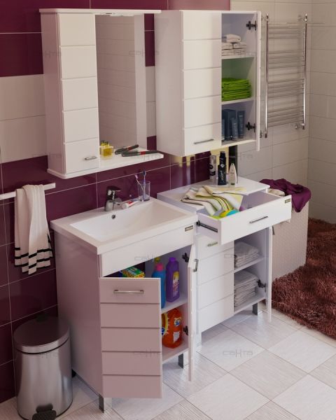 Тумба СанТа отлично подойдет как для просторной ванной комнаты, так и для небольшого помещения. Напольный способ установки производится непосредственно на пол, при этом конструкция максимально устойчива при серьезных физических нагрузках.В производстве используют только качественные влагостойкие материалы (ВЛДСП), в составе которых полностью отсутствуют опасные вещества. Серия отличается превосходным дизайном с соблюдением всех ключевых элементов современного стиля. Основным цветом, в котором выполнена тумба СанТа является белый, гармонирующий с большинством интерьерных решений. Тумба предусматривает удобную и вместительную систему хранения, состоящую из дверей, ящиков. Качественные доводчики позволяют обеспечить мягкое и тихое закрывание.Страной бренда СанТа является Россия, все товары производятся с выполнением соответствующих стандартов качества, что позволяет быть полностью уверенными в долговечности и надежности. Тумба СанТа правильный выбор в современном дизайне ванной, придающий уникальность всему помещению, при этом сохраняя функциональность.