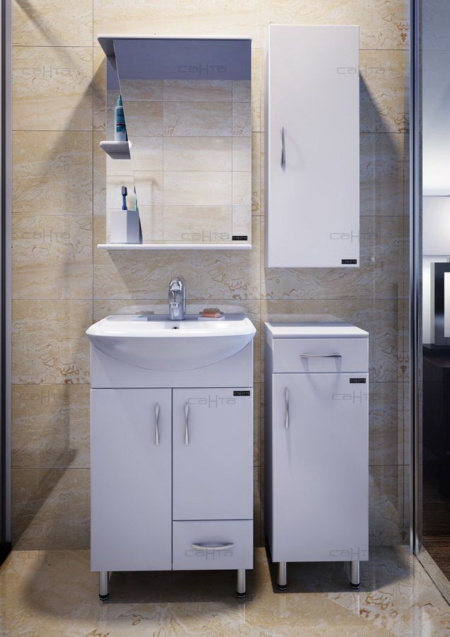 Тумба СанТа отлично подойдет как для просторной ванной комнаты, так и для небольшого помещения. Напольный способ установки производится непосредственно на пол, при этом конструкция максимально устойчива при серьезных физических нагрузках.В производстве используют только качественные влагостойкие материалы (ВЛДСП), в составе которых полностью отсутствуют опасные вещества. Серия отличается превосходным дизайном с соблюдением всех ключевых элементов современного стиля. Основным цветом, в котором выполнена тумба СанТа является белый, гармонирующий с большинством интерьерных решений. Тумба предусматривает удобную и вместительную систему хранения, состоящую из дверей, ящиков. Качественные доводчики позволяют обеспечить мягкое и тихое закрывание.Страной бренда СанТа является Россия, все товары производятся с выполнением соответствующих стандартов качества, что позволяет быть полностью уверенными в долговечности и надежности. Тумба СанТа правильный выбор в современном дизайне ванной, придающий уникальность всему помещению, при этом сохраняя функциональность.