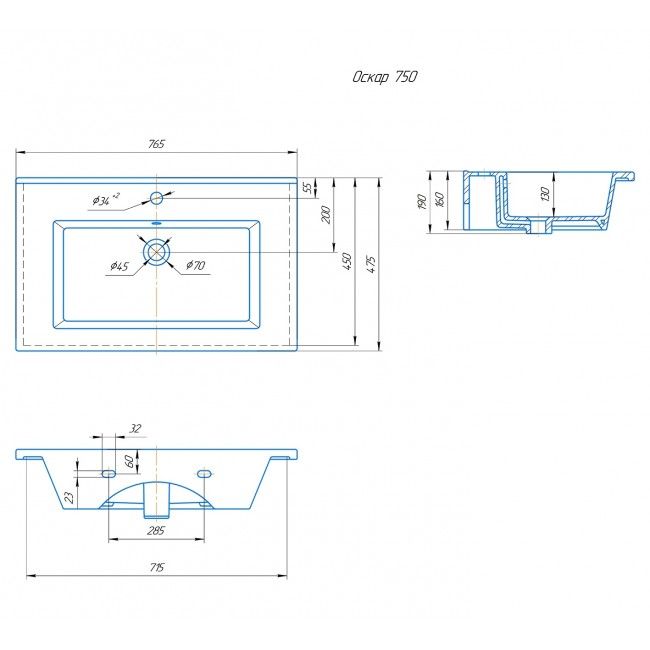 Прямоугольная мебельная раковина "Оскар" устанавливается на мебель, имеет отверстие для смесителя и систему перелива с декоративным кольцом.