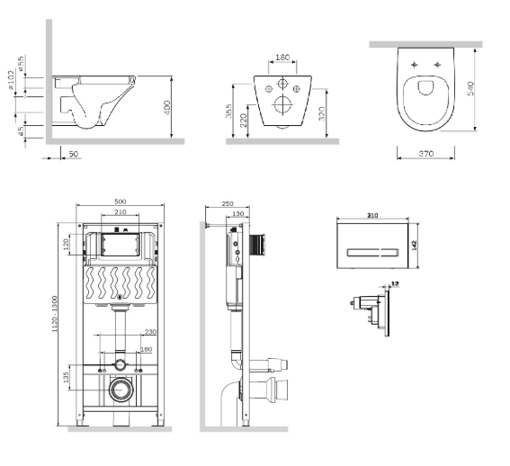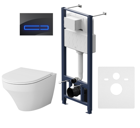 Полностью готовый к установке комплект: система инсталляции с клавишей, подвесной унитаз сиденьем.Не разборная рама из стального профиля выдерживает нагрузку до