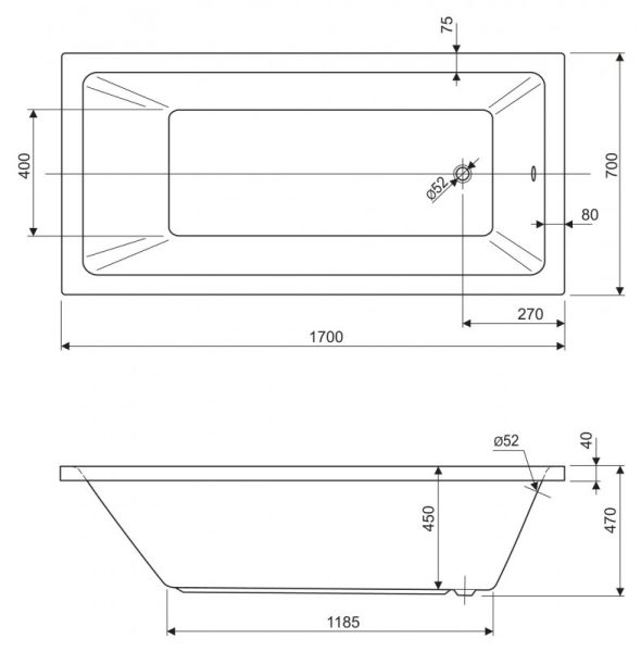 Ванна акриловая Cezares PLANE SOLO-170-70-45-W37