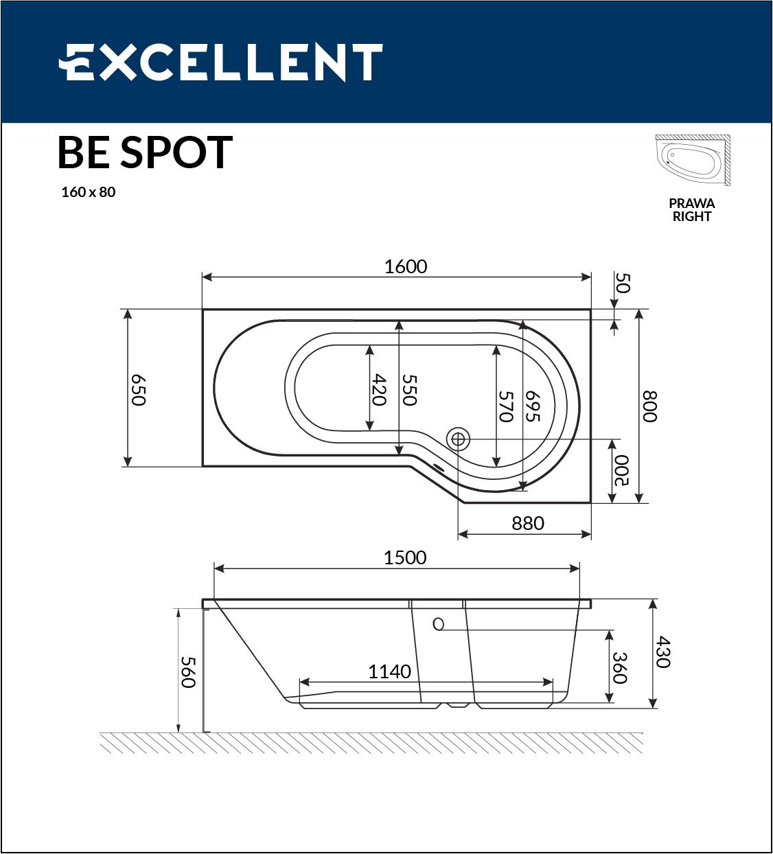 Ванна акриловая EXCELLENT BeSpot 160x80 (правая)