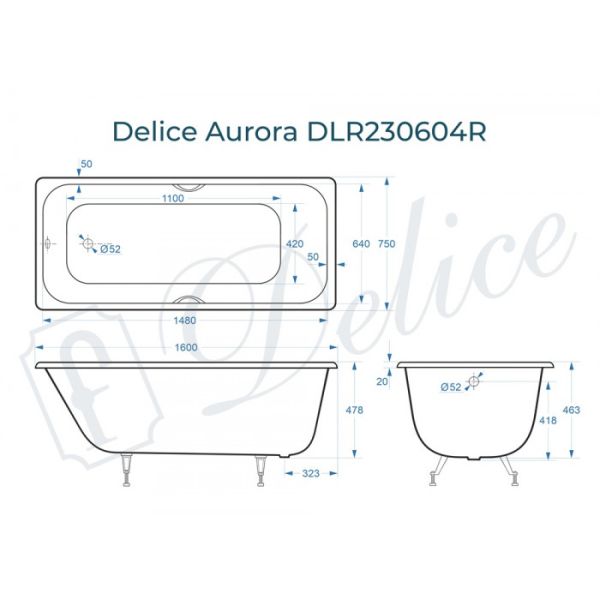 Ванна чугунная Delice Aurora DLR230604R 160x75 с отверстиями под ручки купить