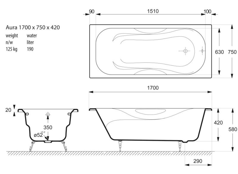 Общие характеристикиРазмер 170х75 Длина 170 см Ширина 75 см Глубина 42 см Высота на ножках 57 см Полезный объём 250 л Вес 125 кг Бренд Vinsent Veron 7 слёв титановой эмали класса 1А Цвет эмали белый Без антискользящего покрытия Диаметр слива Ø52 Расположение перелива стандартное