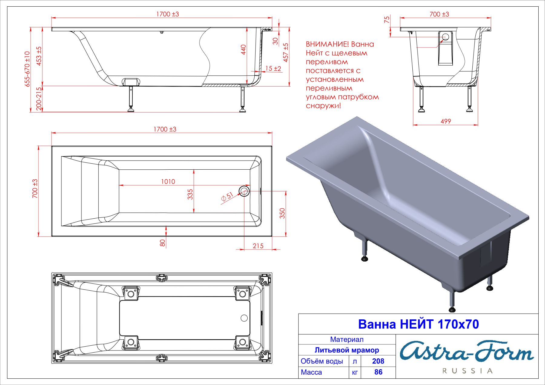Ванна из искусственного камня Astra-Form Нейт 01010055+08010054 170x70 см с щелевым переливом донный клапан белый матовый