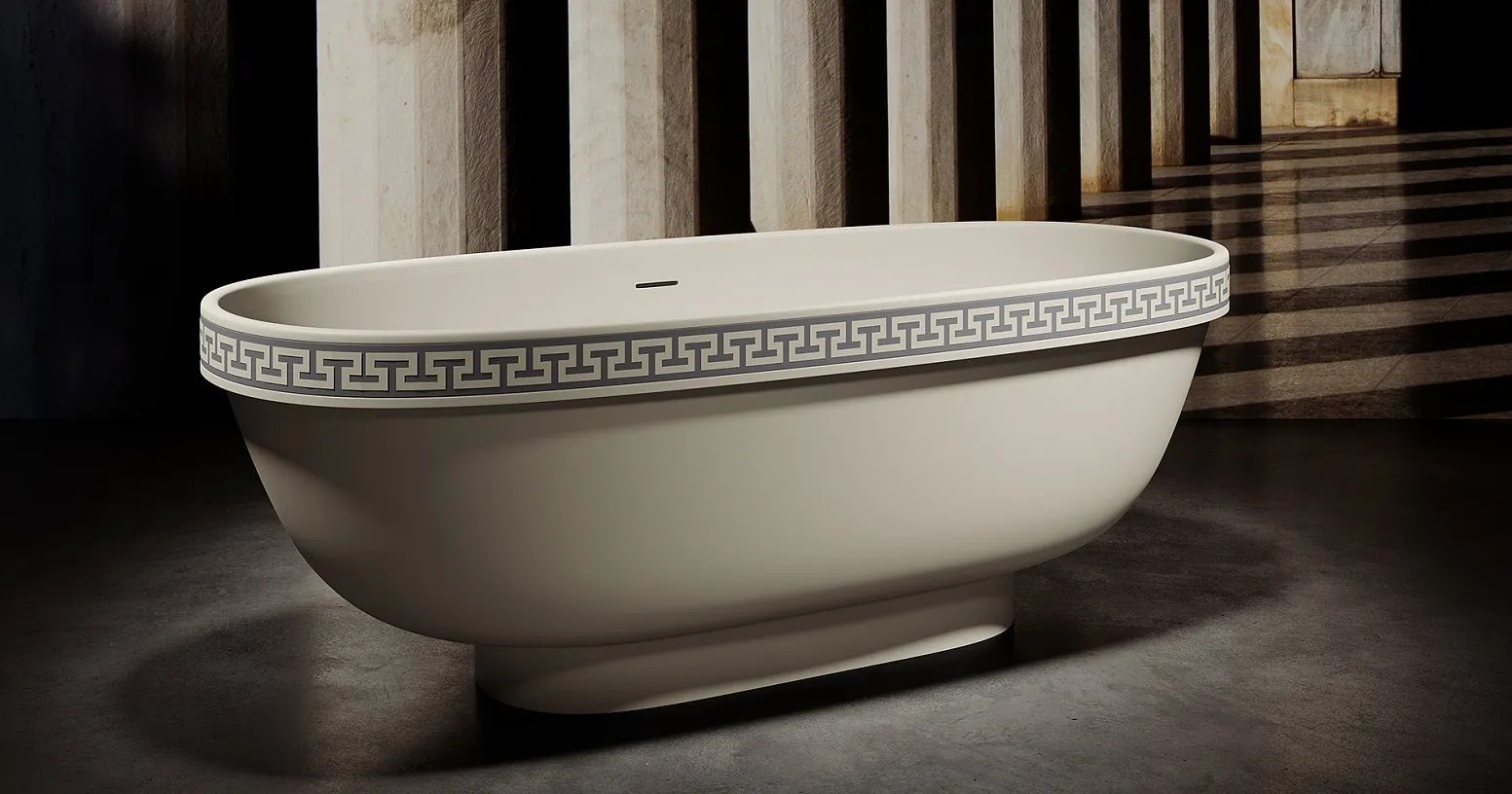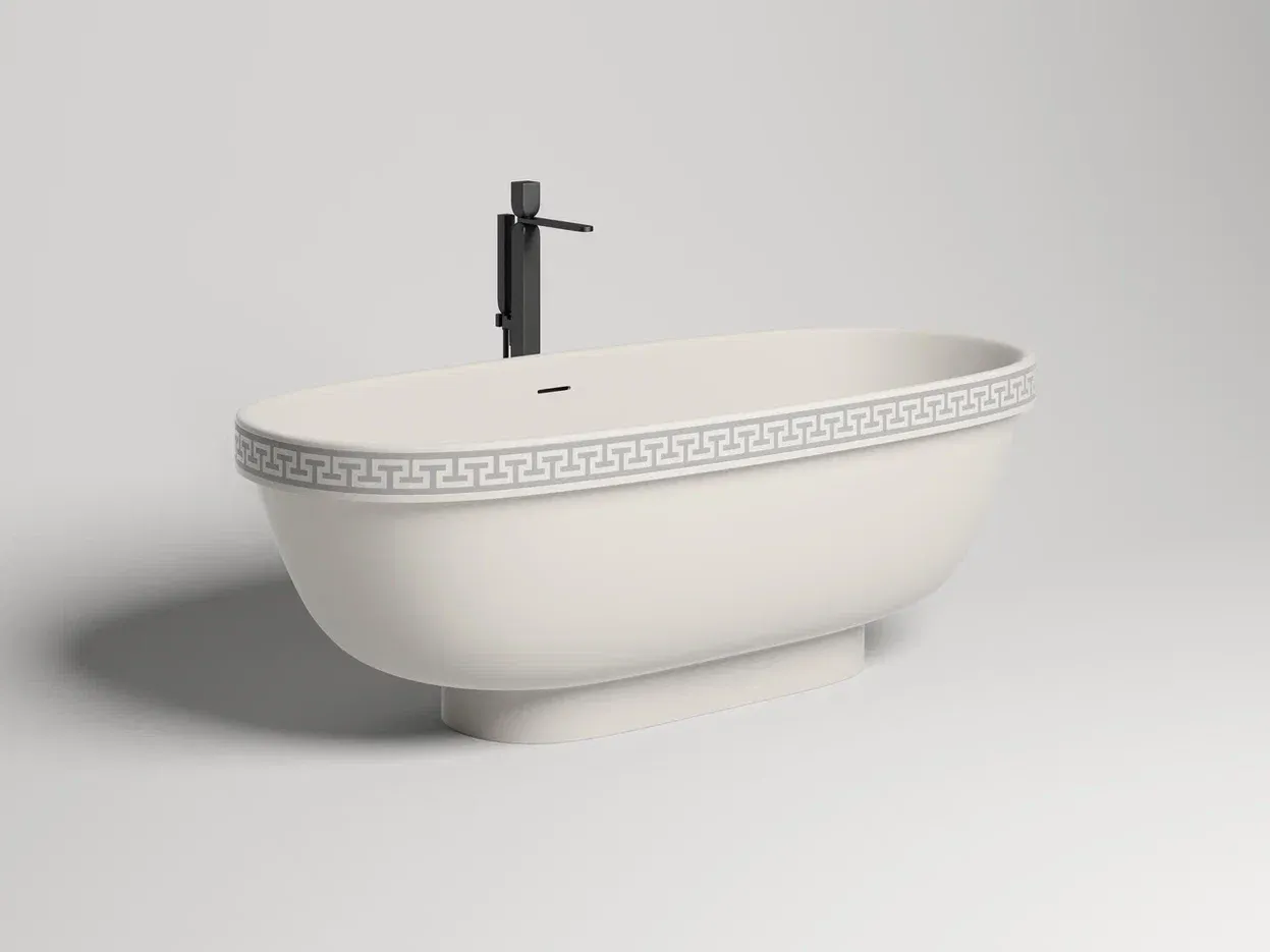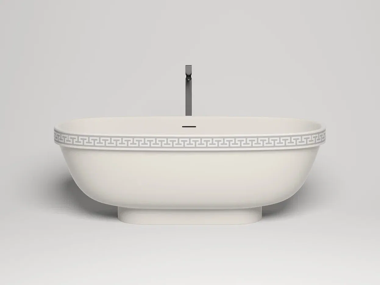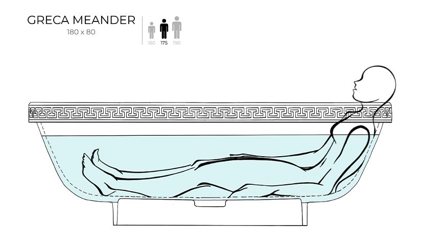 Ванна предлагается в двух версиях — с гладким бортом и бортом, украшенным классическим древнегреческим орнаментом. Полоса орнамента «меандр» из материала S-Shine на основе эпоксидной смолы интегрирована в борт ванны, она прокрашивается в глубину любым цветом палитры RAL Classic. Такой орнамент не сотрётся со временем и никогда не выйдет из моды, как и сама модель классических пропорций.