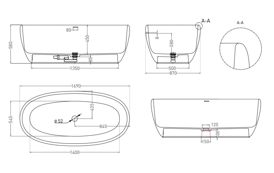 Ванна из искусственного камня Salini Luce S-Stone 100121MRF 170x85см RAL полностью