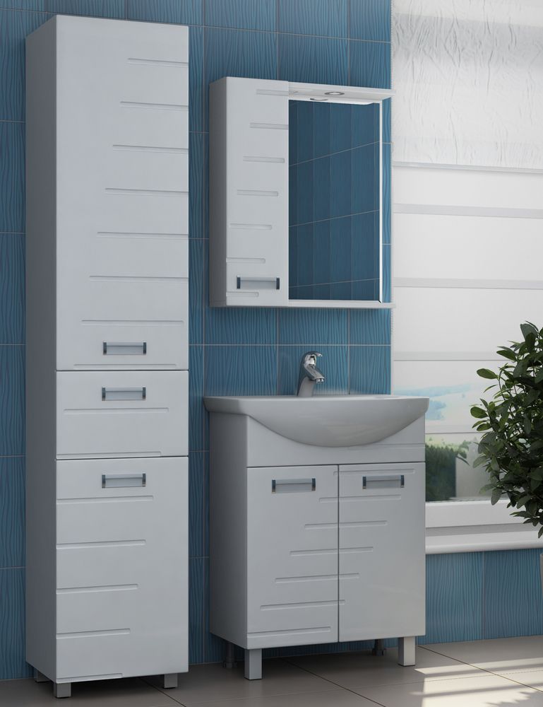 1 дверца; 2 полки ЛДСП, 1 светодиодный светильник, включатель с розеткой; ручка врезная металлическая хромированная.