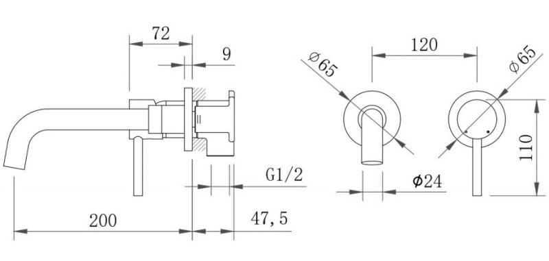 Раздельный смеситель из стены, с удобной поворотной ручкой для регулировки температуры выходящей воды. Выполнен в современном стиле, а так же макси.Встраиваемая система