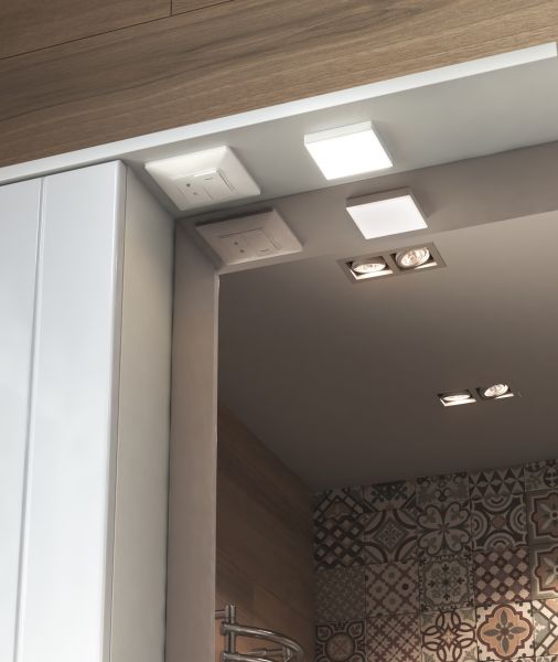 1 дверца; 2 полки ЛДСП; ручка металлическая хромированная; 1 светодиодный светильник, включатель с розеткой.
