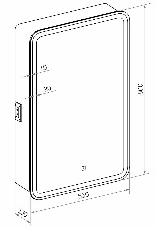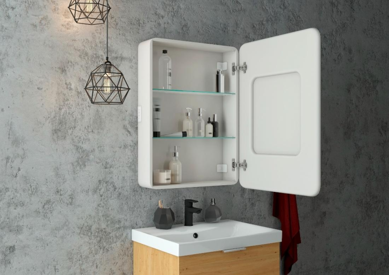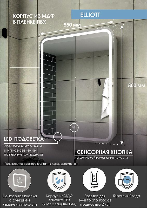 Зеркало-шкаф "Elliott LED" 550х800 правый с розеткойLED подсветка 6000К; сенсорный включатель с функцией димирования, Материал корпуса- МДФ, пленка ПВХ, розетка