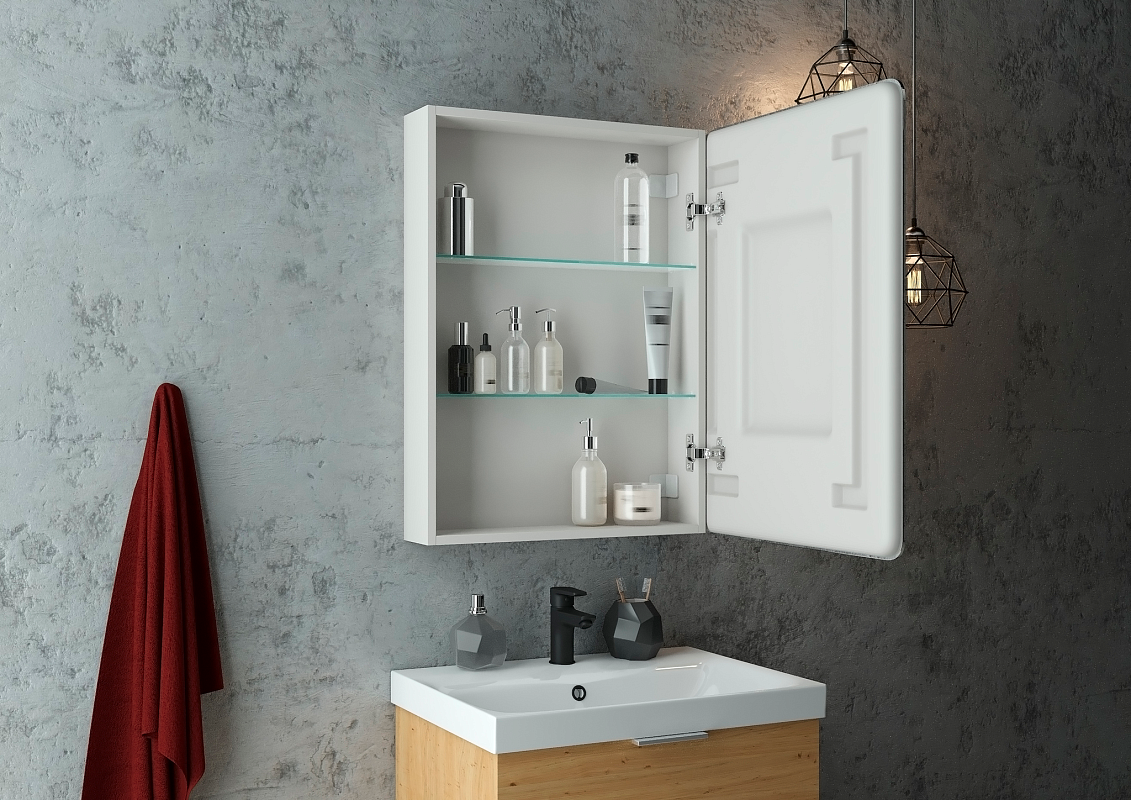 Зеркало-шкаф "Emotion LED" 500х800LED подсветка 6000К; сенсорное включение справа по центру, реверсивные крепления, пластиковый короб, прямые углы на коробе и радиусные на зеркале, полка/2 шт, без розетки, петли Firmax